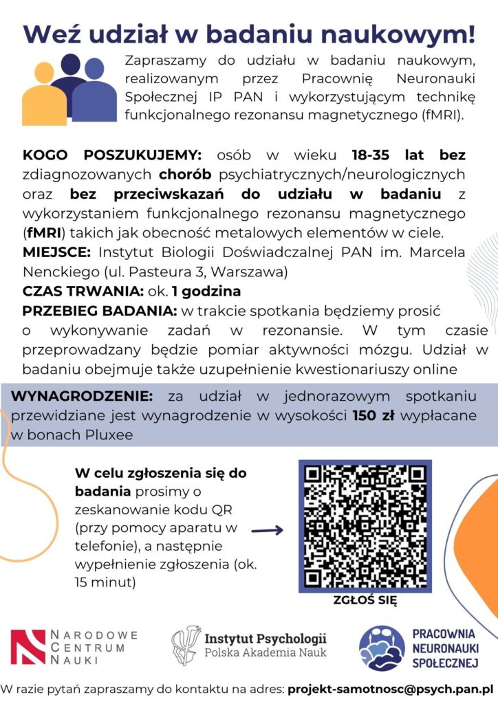 Pełna treść ogłoszenia: http://www.neuronauka-spoleczna.pl/wp-content/uploads/2025/06/ulotka_fmri.pdf