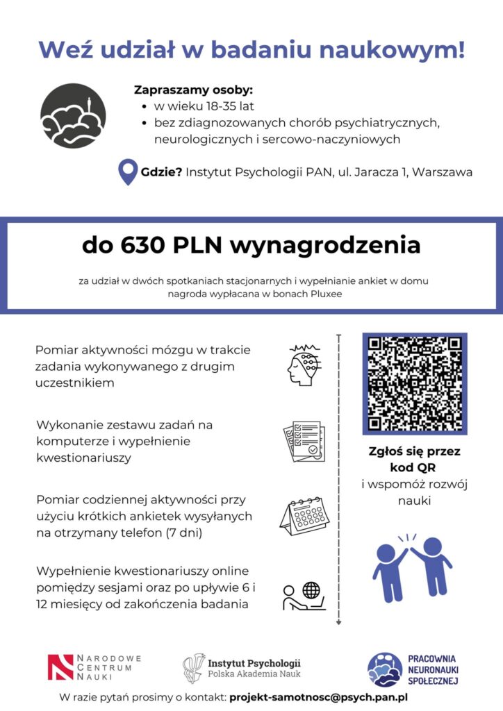 Wszystkie szczegóły można znaleźć w ulotce poniżej, a w celu zgłoszenia się do badania prosimy o wypełnienie kilku kwestionariuszy online dostępnych poniżej (ich wypełnienie powinno zająć ok. 15 minut): https://badania.psych.pan.pl/index.php?r=survey/index&sid=675718&lang=pl